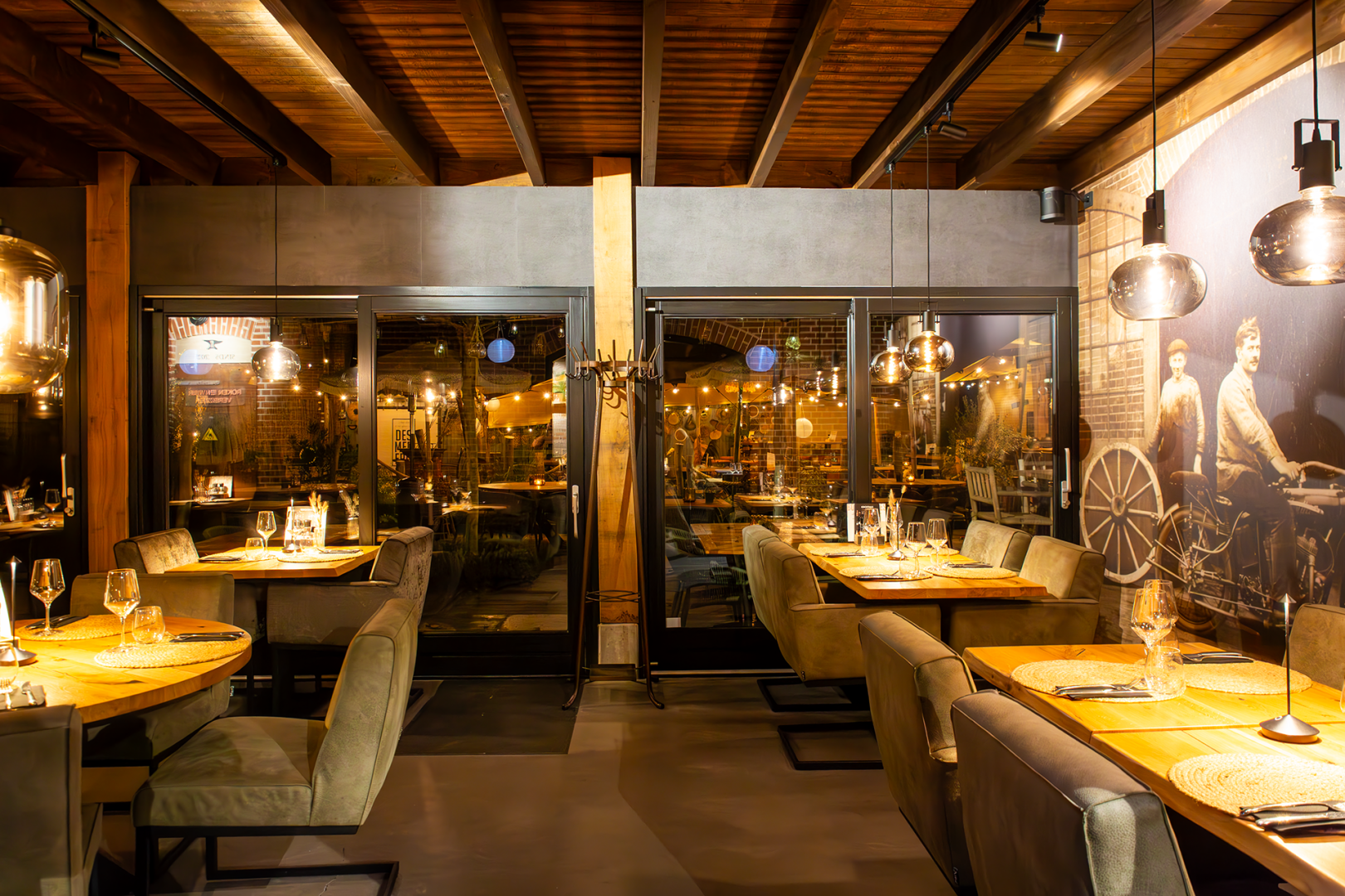 Bij mooi weer is het terras een fijne plek om de avond te beginnen, terwijl binnen de warme sfeer en het vuur van de open keuken zorgen voor een avond lang genieten.